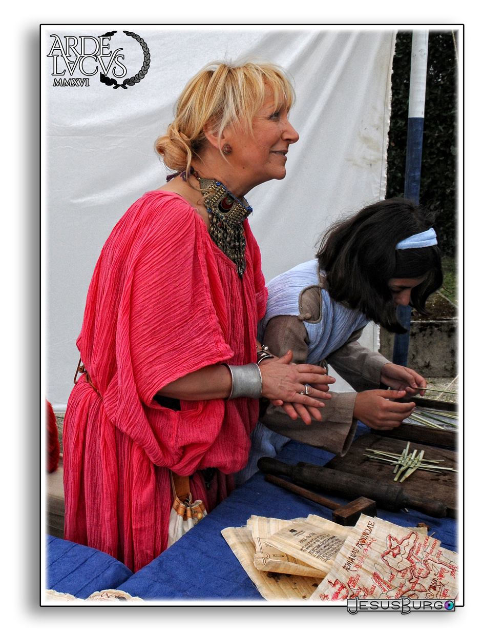 Recreamos en parte lo militar, pero desde una óptica quizás diferente en la medida que hablamos del legionario no tanto como soldado sino como un legionario y cómo vive, de hecho lo que tenemos fundamentalmente y no más porque, como ya dijimos al principio somos 25 socios, tenemos un contubernio, que lo tenemos para hablar de cómo vive un legionario, no como lucha, sino fundamentalmente cómo vive, cómo es su tienda de campaña, qué come, cuánto anda, cuáles son sus obligaciones diarias, porque nos parece que es una forma de hablar de la vida, pero de la vida de un militar. Y por otra parte tenemos otras actividades que lo que hablan es de la vida de un romano pero civil, entonces en eso hablamos de temas como la escritura, hicimos un taller de escritura, hicimos en su día un taller de jabón para hablar de la higiene, también hablamos de la construcción de los mosaicos, cómo se construye un mosaico, todo lo que sería un taller de mosaicos, un taller de acuñación, acuñamos monedas, que nuestra moneda tiene una peculiaridad, es un proceso 100% manual, tanto es así que los cuños se tallan y graban a mano en acero que luego se templa, tenemos un taller de armamento que lo desarrolla nuestro centurión, CAIO VIRIO FRONTÓN, y después lo que hicimos últimamente fue colaborar, nos parecía también muy interesante, precisamente y hablando de la Pax, y del entendimiento entre las gentes, colaborar, y en esa idea, de hecho el último Arde Lucus lo que hicimos fue tener con nosotros en todo momento al Grupo de recreación histórica de Badalona, porque tienen una filosofía muy parecida a la nuestra, de echo los conocimos a través de una invitación, y nos pareció interesante porque ellos tenían el mismo esquema de campamento, es decir pequeñas tiendas, en la que en cada una de ellas se habla de un aspecto de la vida cotidiana, y de hecho en el último Arde Lucus hicimos un taller en el que se hablaba de la prostitución, un taller en el que se fabricaban embutidos, se hacía escabechado de pescado, se fabricaban cuerdas y calzado, se hablaba de las unidades de medida, de los pesos, entonces nos parecía que eso era muy interesante porque nosotros queremos que lo romano deje de ser solamente lo militar, pero sin olvidarlo, eso siempre, no lo queremos olvidar, pero Roma era mucho más que un ejército.