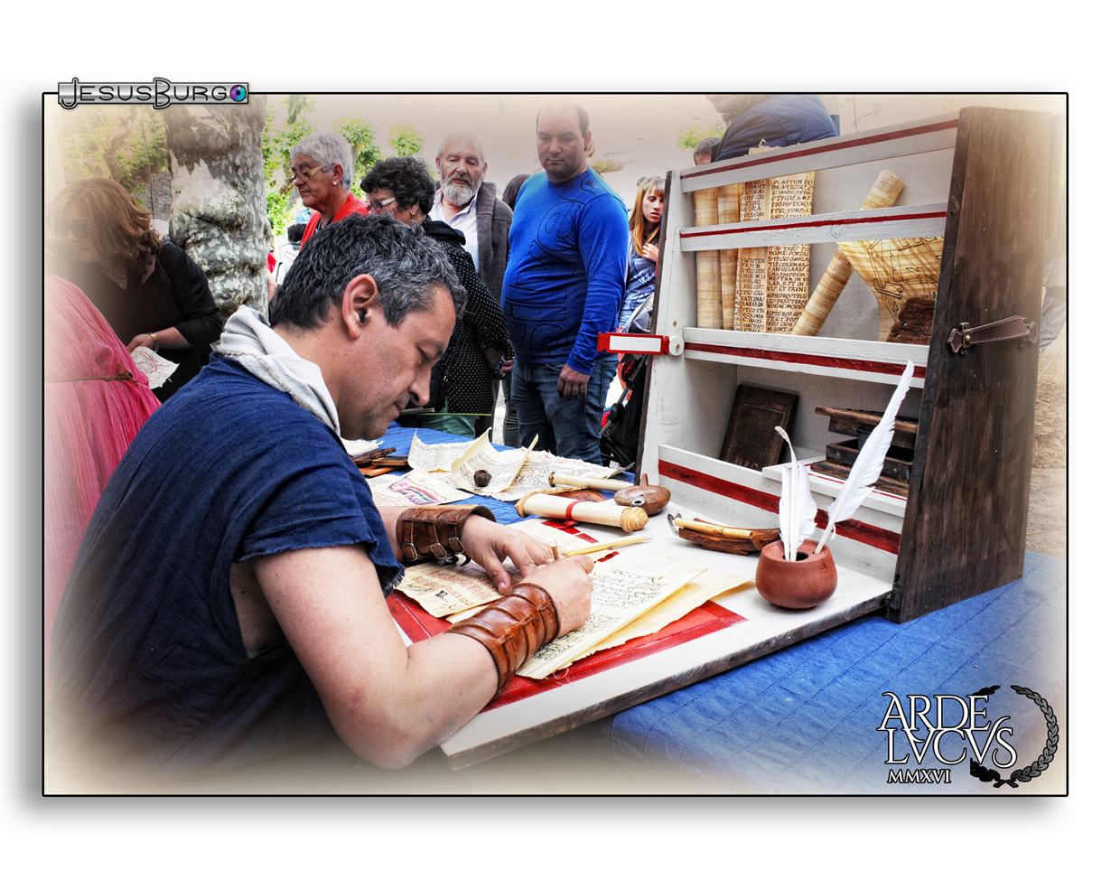 Es que cuando Caetra nació, justo nació la asociación de Cacabelos y nos conocimos en Las Médulas, quedamos un día en Las Médulas para conocernos, porque ellos habían visto lo que estábamos haciendo y les dejamos los moldes para hacer los escudos, les dejamos las plantillas de los dibujos, y son , para mí, unos grandísimos amigos. De hecho yo, cuando empecé con el taller de escribano, había uno de ellos que es un sibarita, y se venía los sábados, y nos juntábamos para escribir y de hecho tenemos un proyecto común, que ahora está parado por la pandemia, pero entre los dos estamos intentando hacer un proyecto importante a nivel nacional, que será una sorpresa algún día. Pero lo pasamos muy bien, pero ya te digo estuvimo en Bíbilis como dices tú, estuvimos en Cacabelos, como recreadores, yo estuve en Oporto, en Badalona, en las Guerras Cántabras, en muchos sitios.